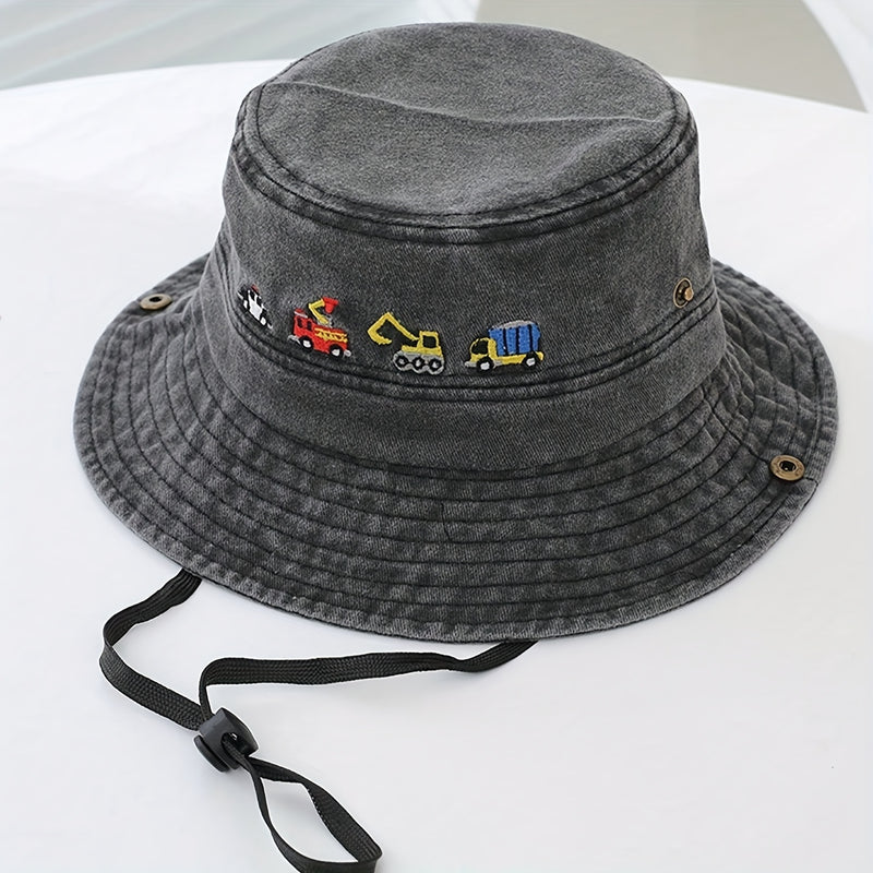 Sombrero de ala ancha con estampado de coches para niños, con correa ajustable, ligero, impermeable y protección solar para todas las estaciones. Ideal para actividades al aire libre y celebraciones de vacaciones. Diseño estampado, sombrero ligero.